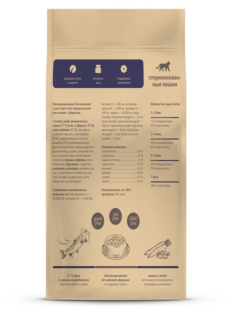 SAVITA Беззерновой корм для стерилизованных кошек с форелью, 2кг