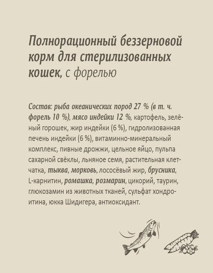 | Особые потребности | беззерновой / для стерилизованных/кастрированных |