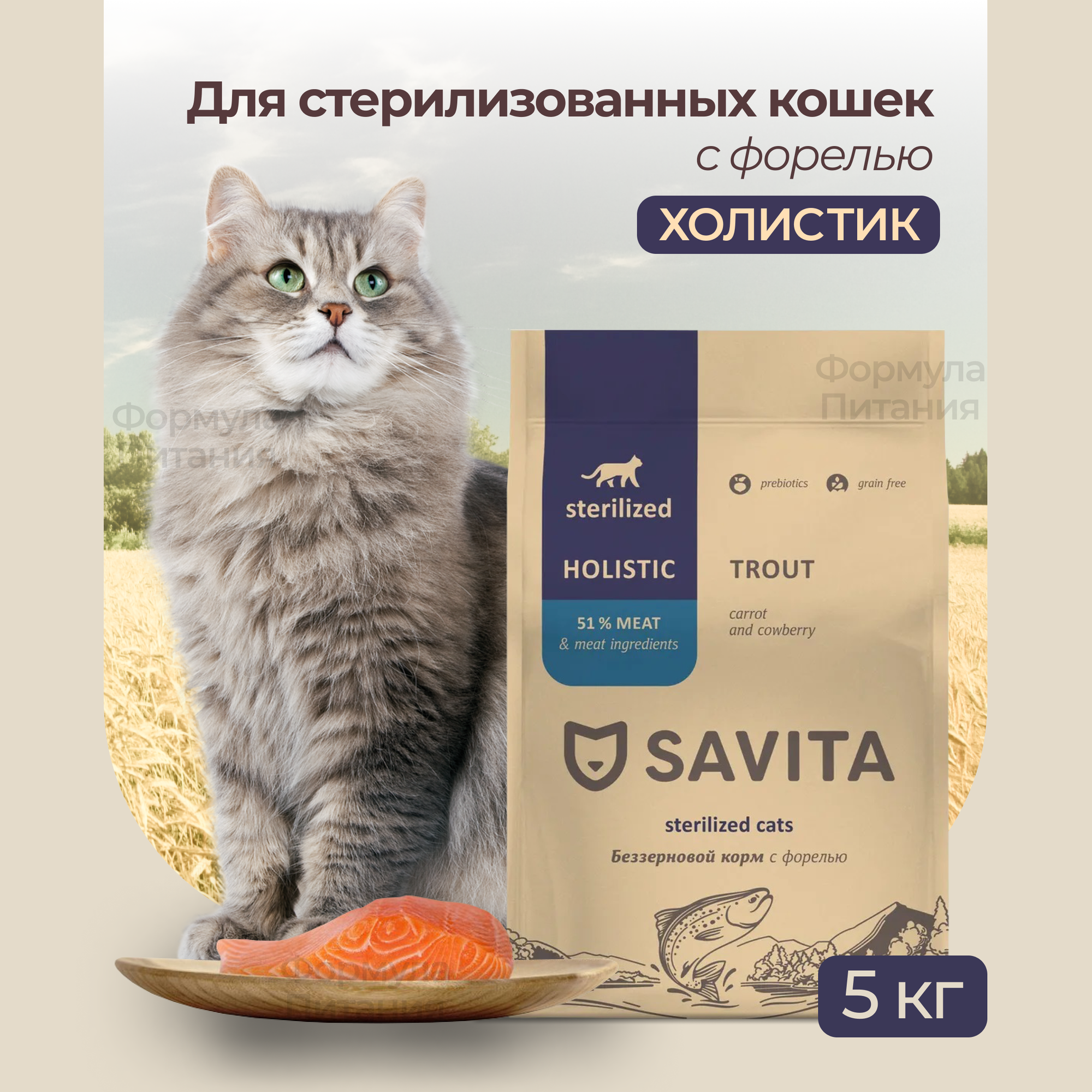 SAVITA Беззерновой корм для стерилизованных кошек с форелью, 5 кг