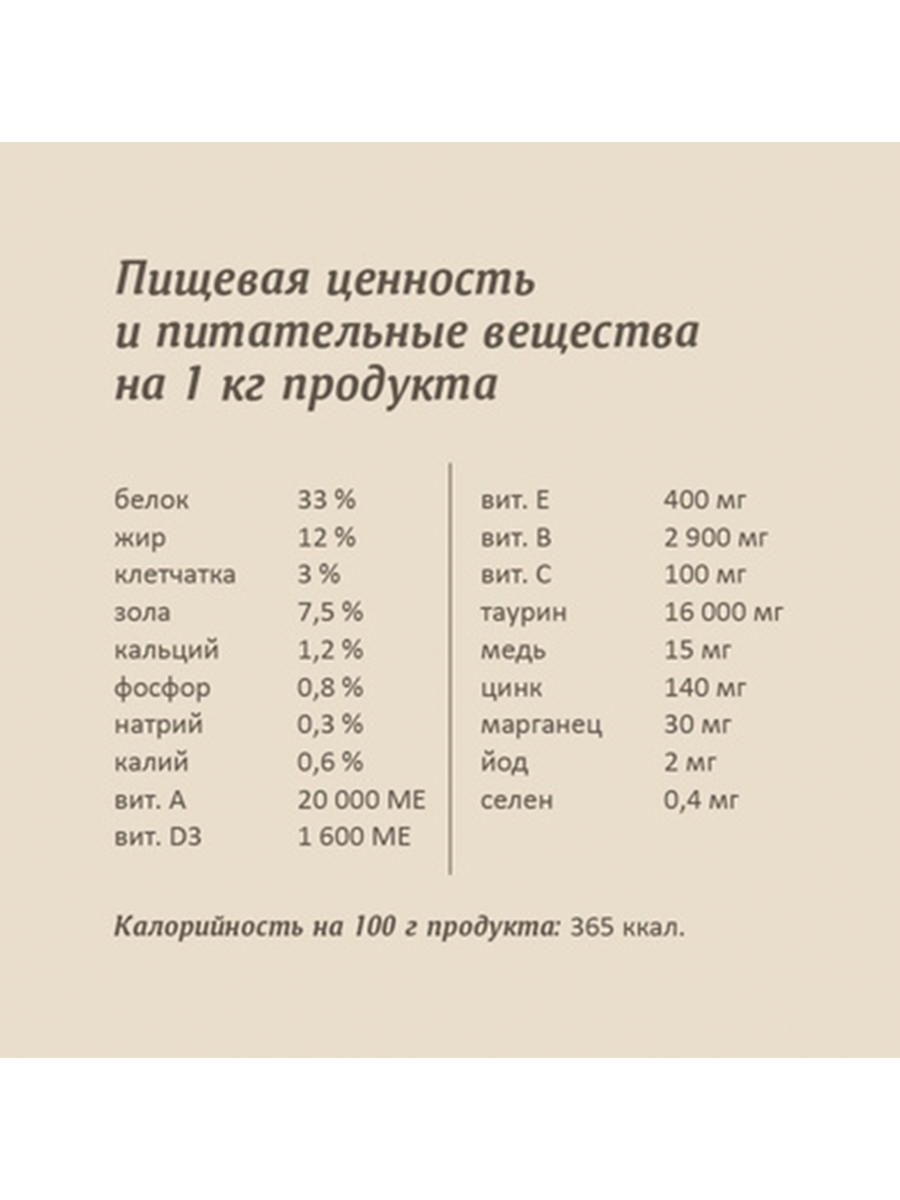| Витамины | витамин A 20 000 МЕ, витамин D3 1 600 МЕ, витамин E 400 мг, витамины группы В 2900 мг, витамин C 100 мг |