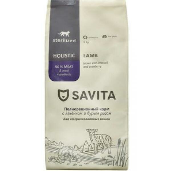 Купить Сухой корм SAVITA для стерилизованных кошек с ягненком и бурым рисом, STERILIZED ADULT Skin&Coat Care, Lamb & Brown rice, 5 кг