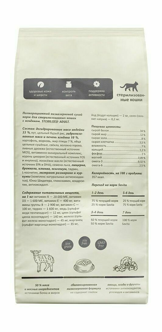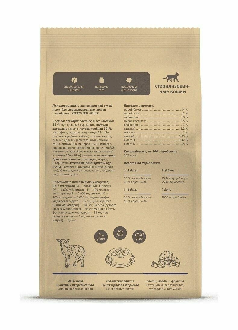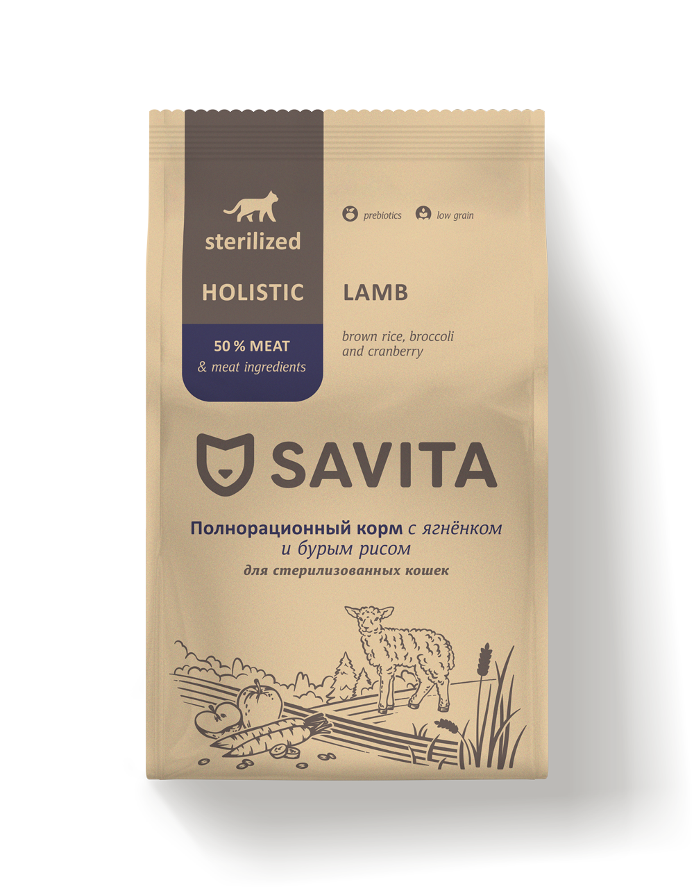 Сухой корм SAVITA для стерилизованных кошек с ягненком и бурым рисом, STERILIZED ADULT Skin&Coat Care, Lamb & Brown rice, 2 кг