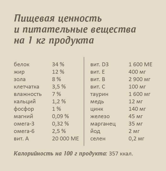 | Пищевая ценность | сырой белок 34%, сырой жир 12%, сырая клетчатка 3%, сырая зола 7%, кальций 1,3%, фосфор 0,8%, натрий 0,3%, калий 0,6% |