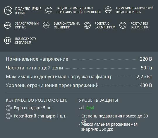 | Дополнительная информация | подключение к ИБП, ударопрочный корпус, защита от импульсных помех, термобиметаллический предохранитель, выключатель на обе линии, степень подавления помех до 30 дБ, максимальная рассеиваемая энергия 350 Дж |