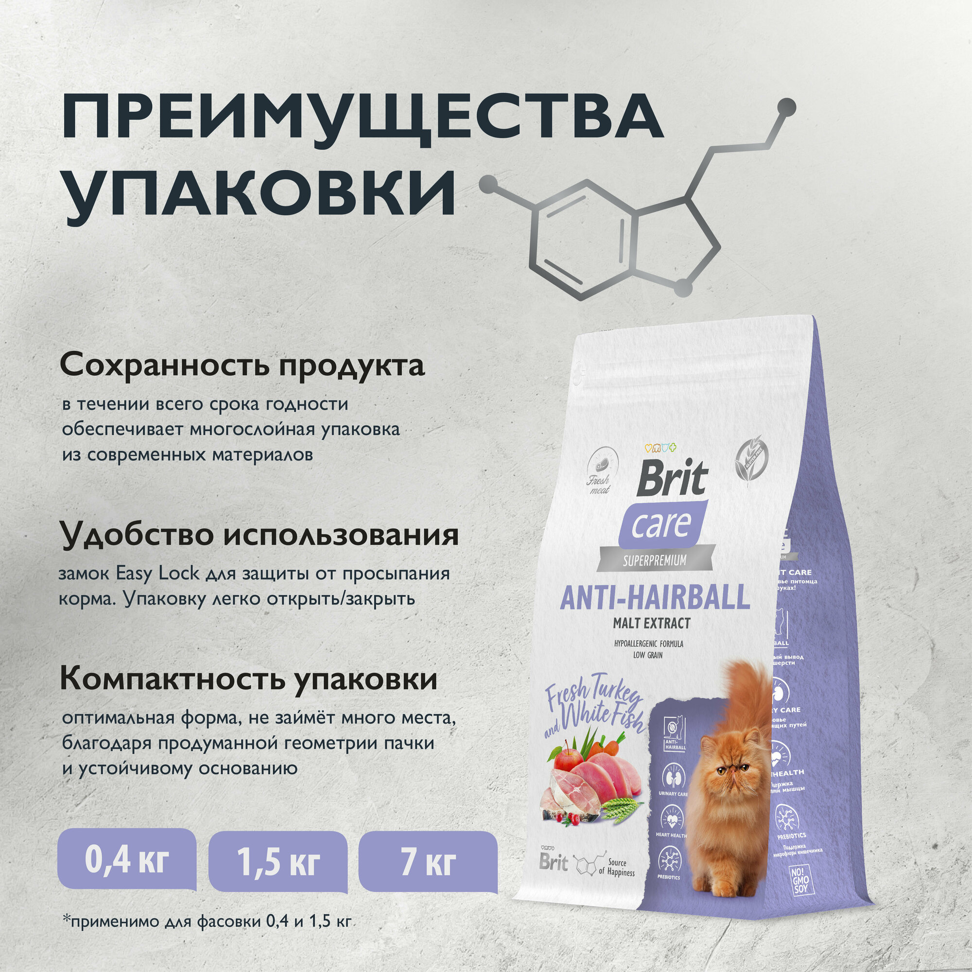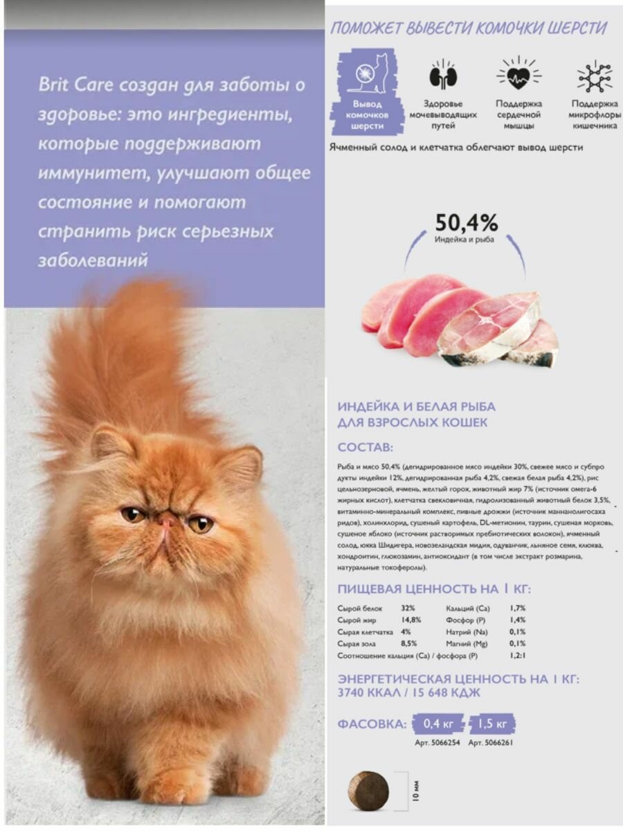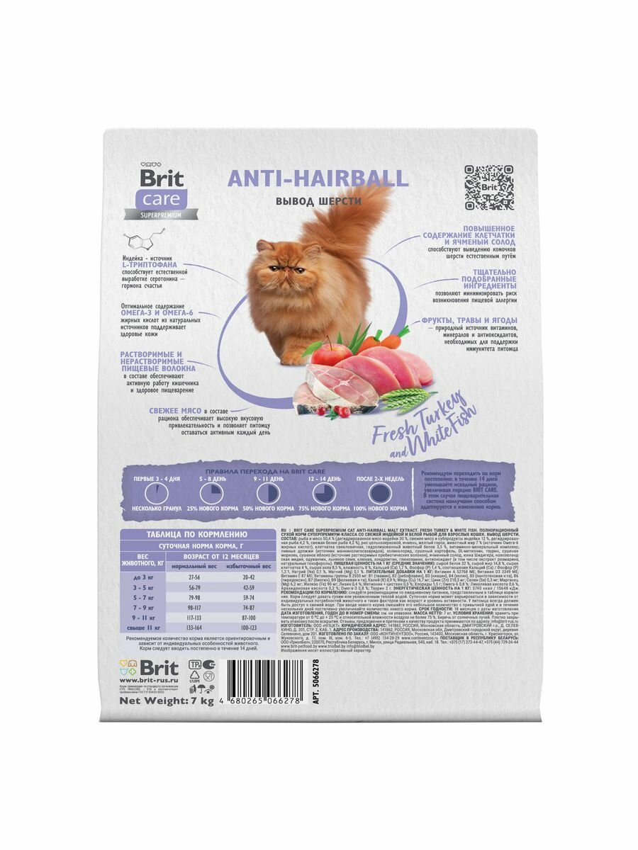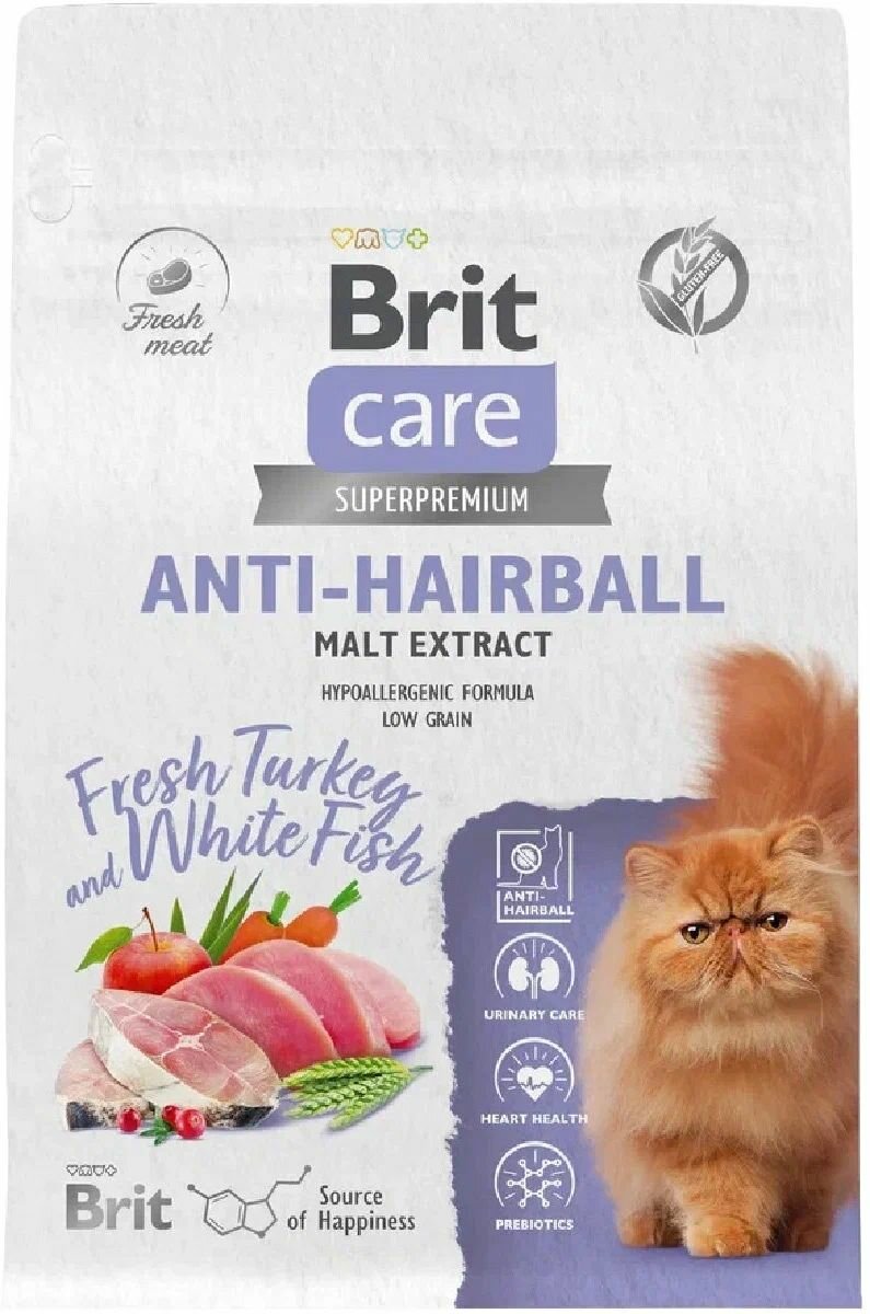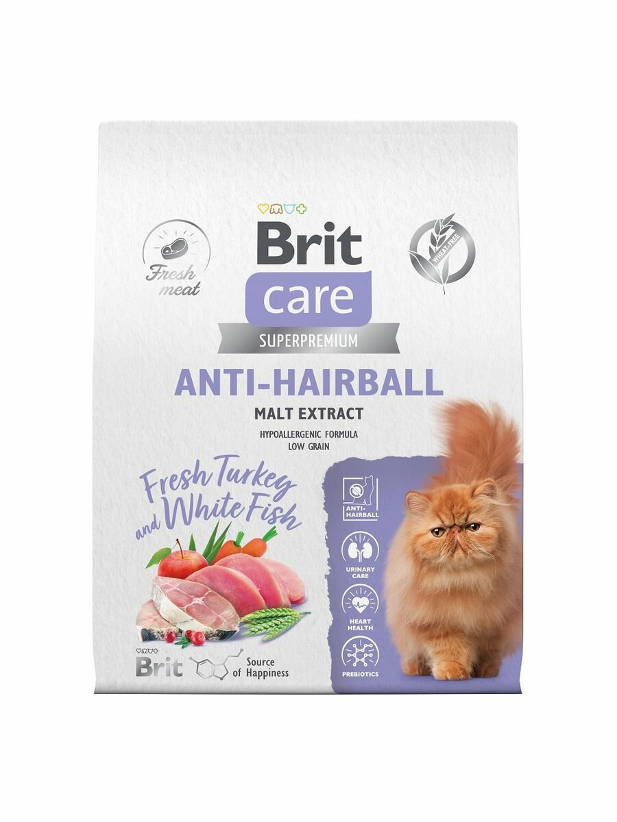 Brit Care сухой корм Superpremium Cat Anti-Hairball с белой рыбой и индейкой для взрослых кошек, Вывод шерсти 7кг