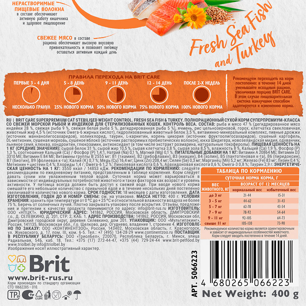 Brit Сухой корм Care Cat Sterilised Weight Control с морской рыбой и индейкой для стерилизованных кошек Контроль веса, 1,5кг 1.5 кг
