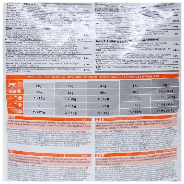 | Состав | тунец 5%; мука из курицы и индейки, кукуруза, размолотый рис, животный жир, мука из кукурузного глютена, мука из тунца, минералы, сухая пульпа сахарной свеклы, гидролизат белка, рыбий жир |