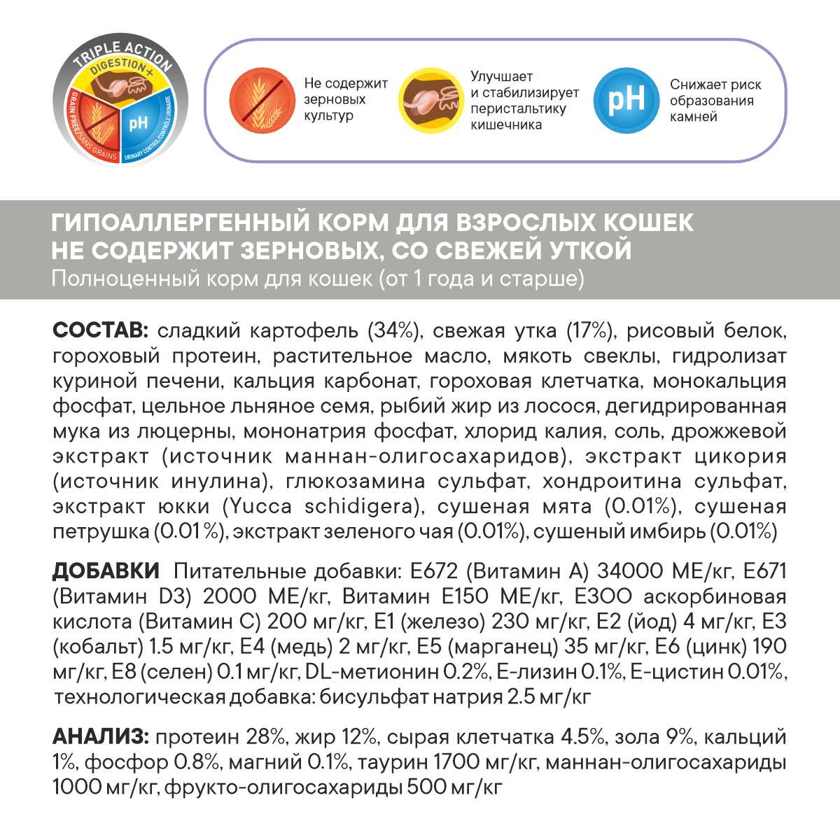 1st Choice корм для взрослых кошек беззерновой с уткой и картошкой, гипоаллергенный