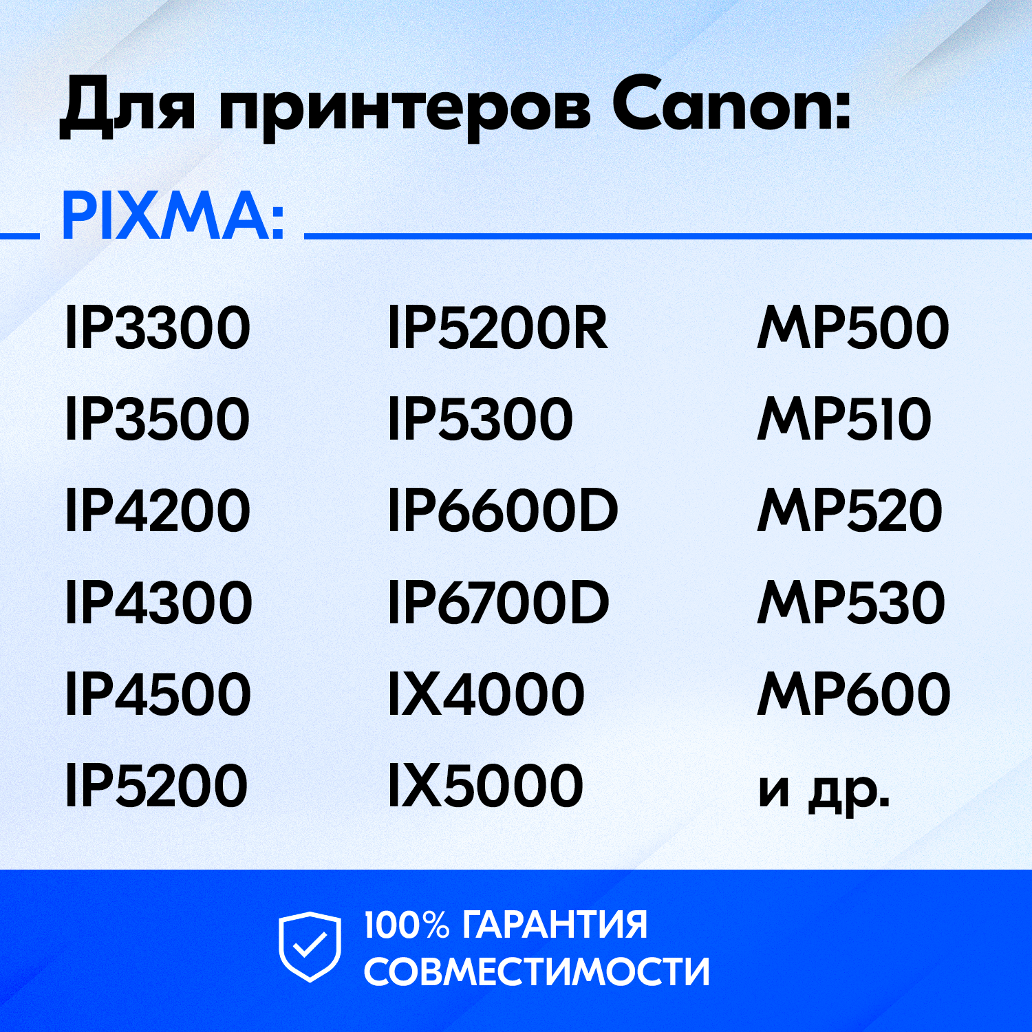 | Модель совместимого принтера | Canon Pixma MP500 / Canon Pixma MP510 / Canon Pixma MP520 / Canon Pixma MP530 / Canon Pixma MP600 / Canon Pixma MP610 / Canon Pixma MP800 / Canon Pixma iP3300 / Canon Pixma iP3500 / Canon Pixma iP4200 / Canon Pixma iP4300 / Canon Pixma iP4500 / Canon Pixma iP5200 / Canon Pixma iP5200R / Canon Pixma iP5300 / Canon Pixma iP6600D / Canon Pixma iP6700D / Canon Pixma iX4000 / Canon Pixma iX5000 |