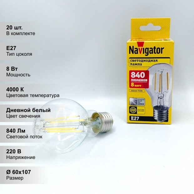 Купить (20 шт.) Светодиодная лампочка Navigator A60 8Вт 230В 4000K E27 филамент.