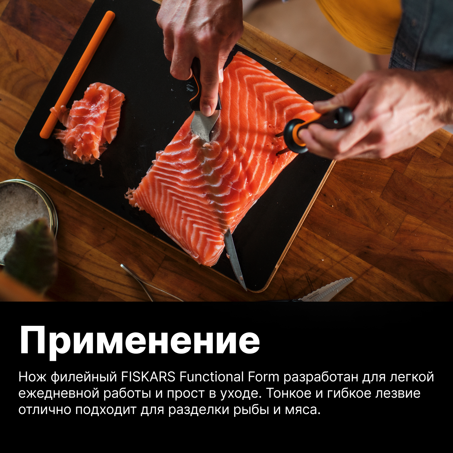 Нож кухонный Fiskars Functional Form 1057540 стальной филейный лезв.216мм прямая заточка черный/оранжевый