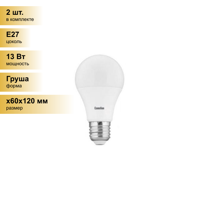 Купить (2 шт.) Светодиодная лампочка Camelion ЛОН A60 E27 13W(1045lm 270°) 3000K 2K матов. 120x60 пластик LED13-A60/830/E27 . Цоколь E27
