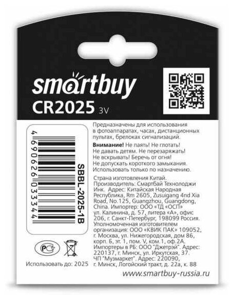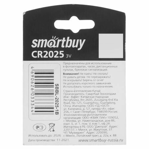 Литиевый элемент питания SMARTBUY (SBBL-2025-1B) CR2025/1B 1 шт.