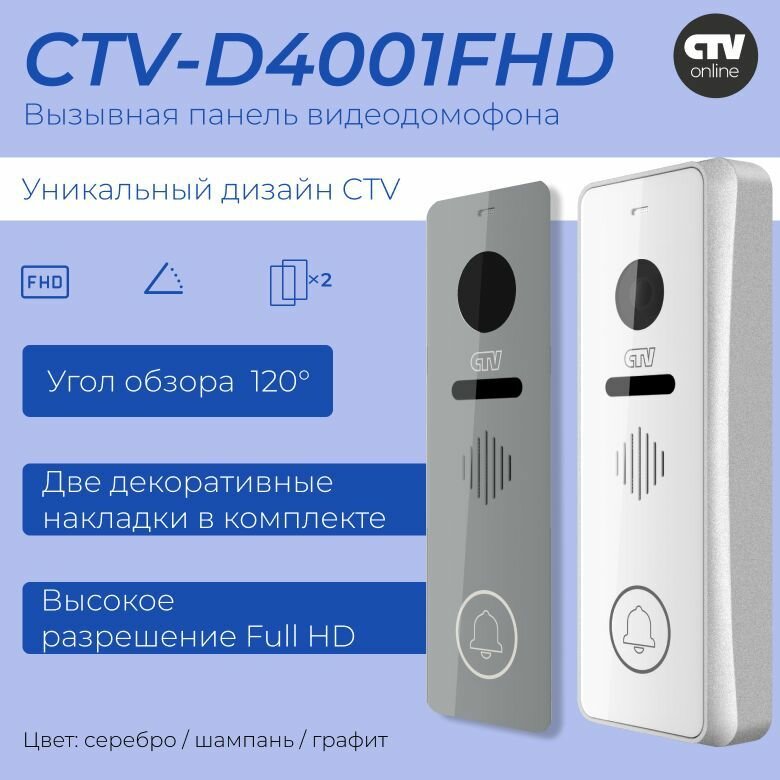 Вызывная панель видеодомофона CTV-D4001FHD (Серебро), Видеокамера 2Mp FULL HD, обзор 115 градусов. ИК-подсветка. Антивандальный корпус, -40.+50С