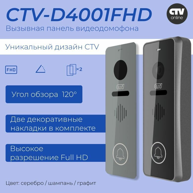 Вызывная панель видеодомофона CTV-D4001FHD (Серебро), Видеокамера 2Mp FULL HD, обзор 115 градусов. ИК-подсветка. Антивандальный корпус, -40.+50С