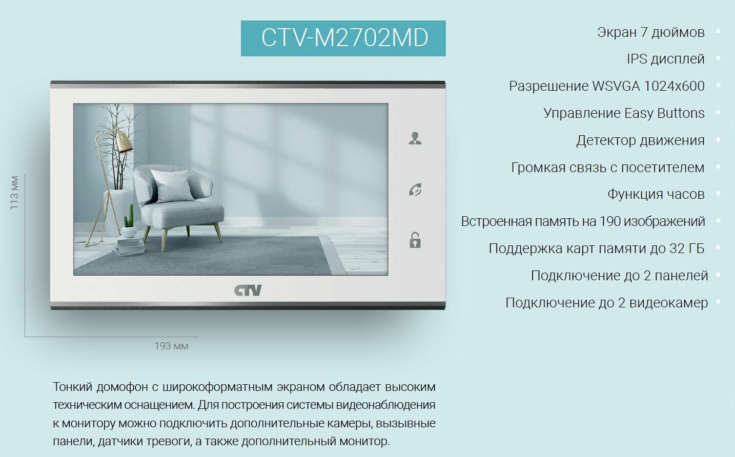CTV-DP2702MD (Белый) Комплект видеодомофона для квартиры, IPS экран 7" (1024x600), с записью видео по детекции движения, угол обзора 115 градусов, автоответчик, HOOK