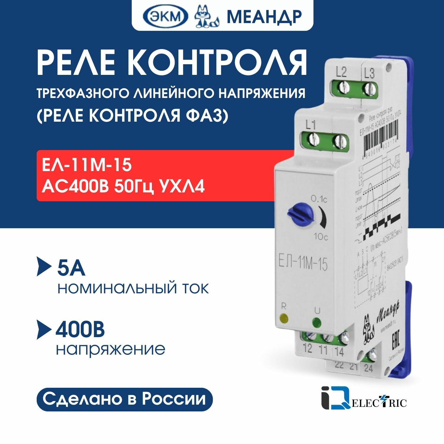 Реле контроля трехфазного напряжения ЕЛ-11М-15 AC400В УХЛ4 с задержкой срабатывания 01...10с ток контактов исполнительного реле 8А 2п Меандр меандр A8302-16933174 (1 шт.)