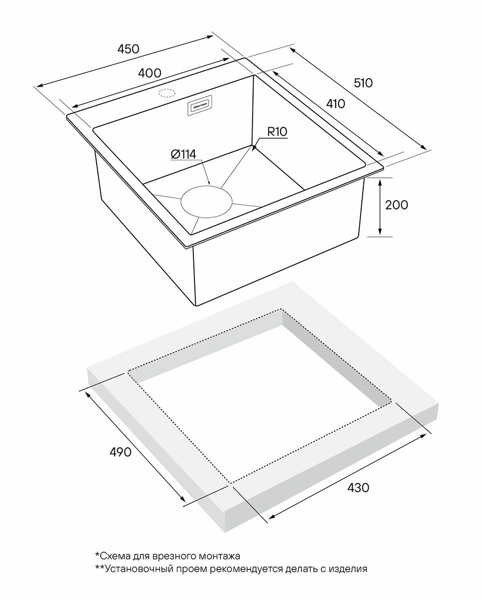 Мойка для кухни из нержавеющей стали AISI304 Paulmark VELTEN 45, 450х510 мм, PVD и шумопоглащающее покрытие, отверстие под смеситель, универсальный монтаж, цвет нерж. сталь