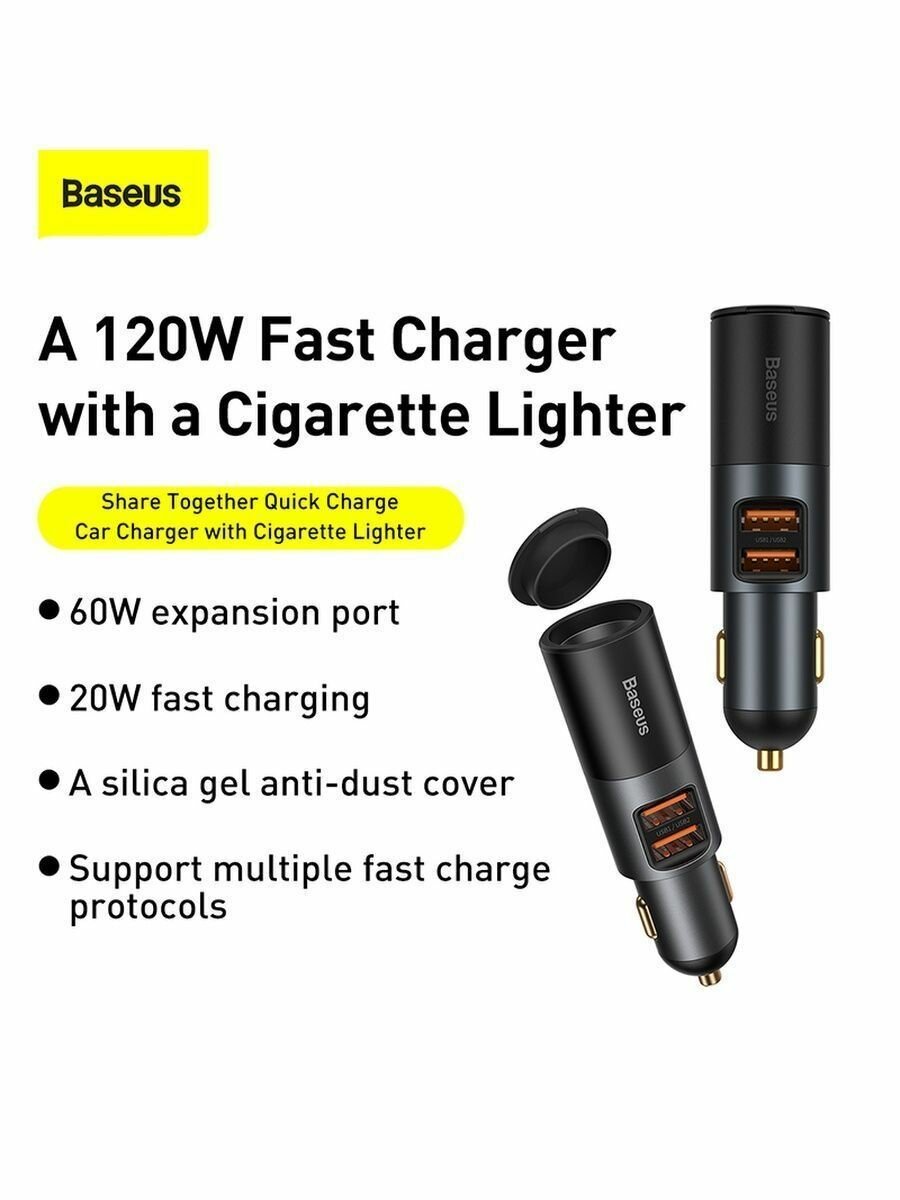 СохранитьАвтомобильное зарядное устройство BASEUS Share Together Port, 2xUSB + прикуриватель, 3A, 120W, черный интересное: