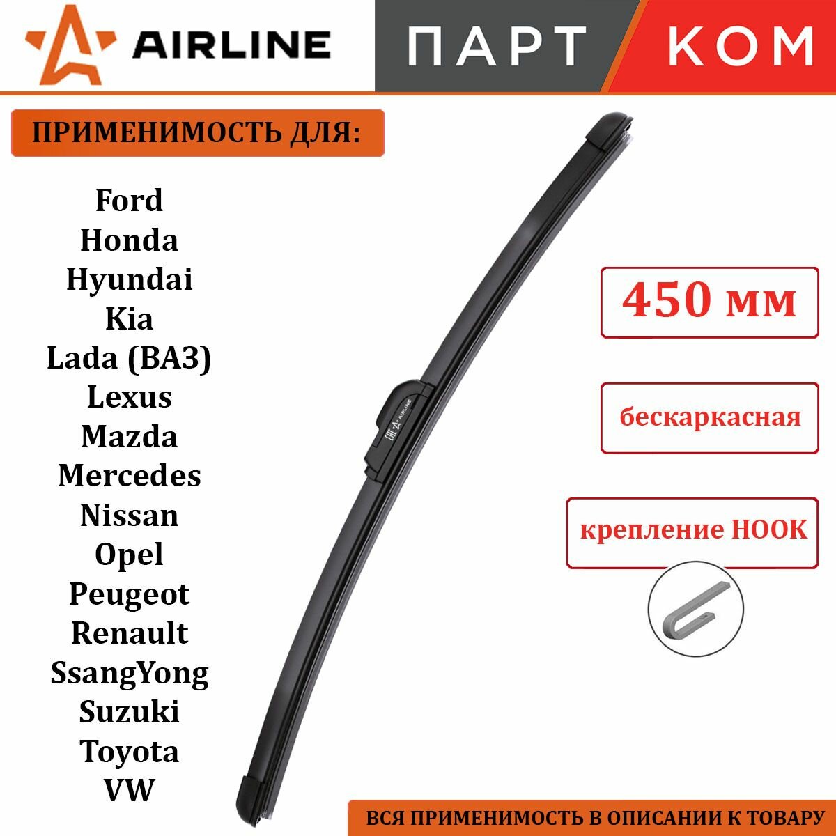 Купить Щетка стеклоочистителя бескаркасная 450 мм AIRLINE AWBBKP450 для а/м Honda, Hyundai, Kia, Mazda, Nissan, Toyota, VW