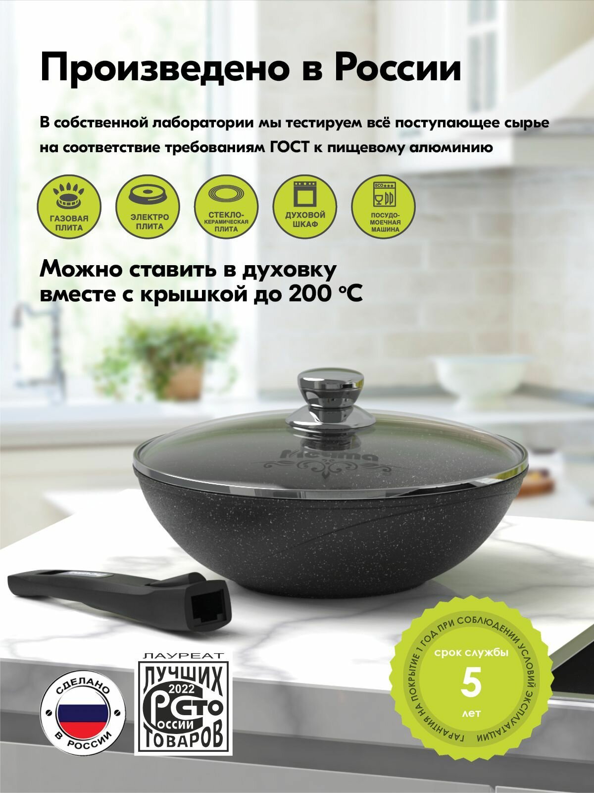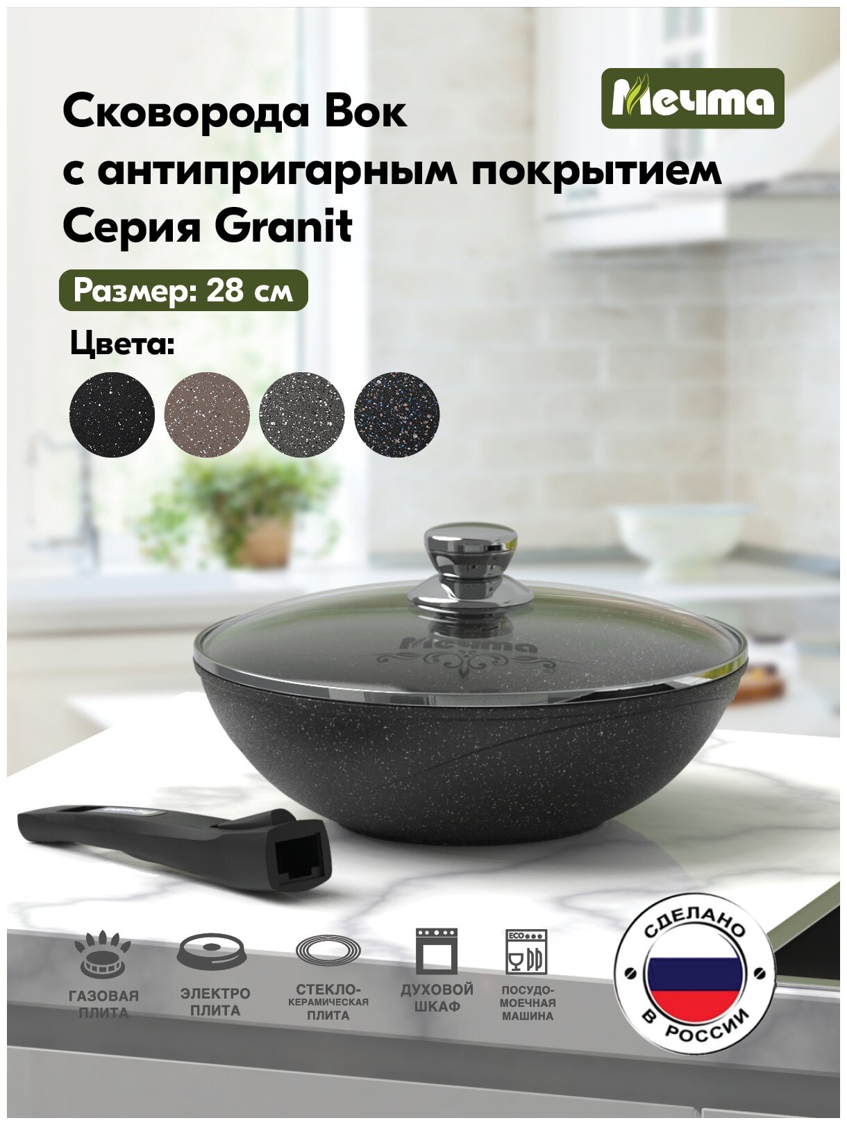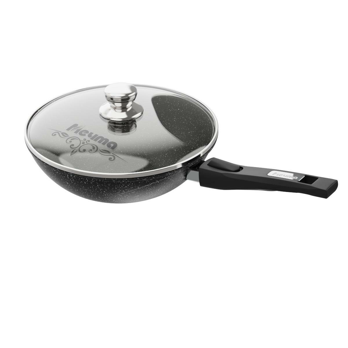 Мечта Сковорода "Гранит ВОК", d28 см, съёмная ручка, стеклянная крышка