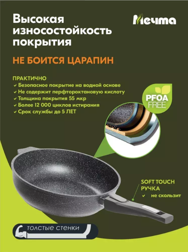 | Плюсы: | очень нравится, съемная ручка- можно в духовке готовить, да и хранить тоже удобно. качество на высоте, ного лет пользуюсь"мечтой" лет на 5-7 покрытия хватает, может и больше было бы, но частенько перекаливаю ( мой косяк). В общем купила сразу 2- разных размеров. |