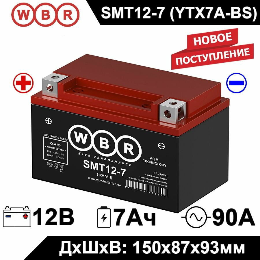 Купить Мото аккумулятор стартерный WBR MT 12-7 12В 7Ач (12V 7Ah) полярность прямая 90A (YTX7A-BS, CT 1207) AGM, аккумулятор для мотоцикла, мопеда, скутера, квадроцикла, снегохода SMT12-7