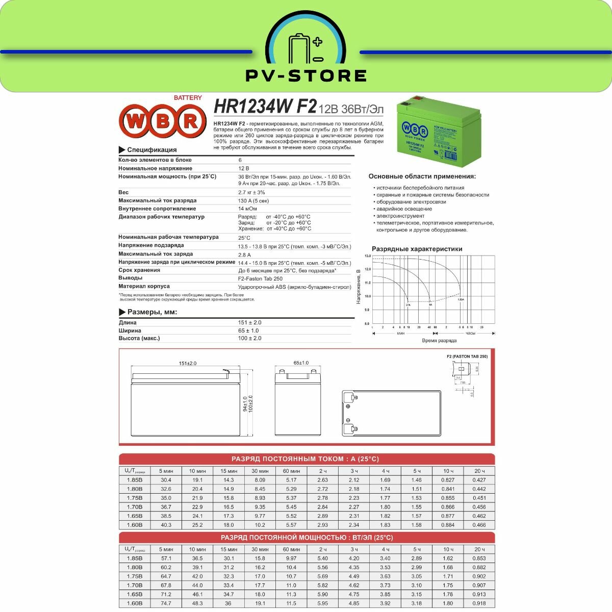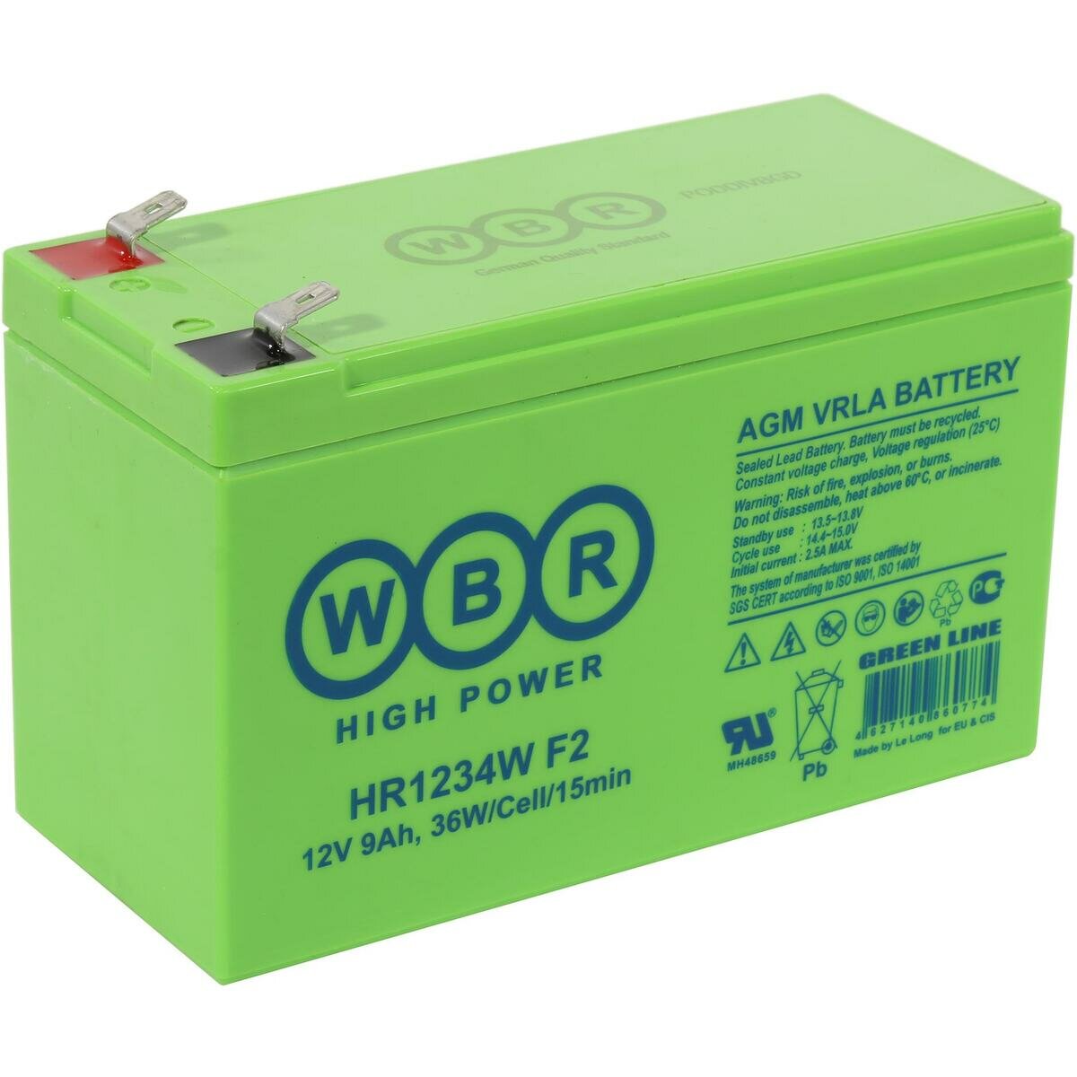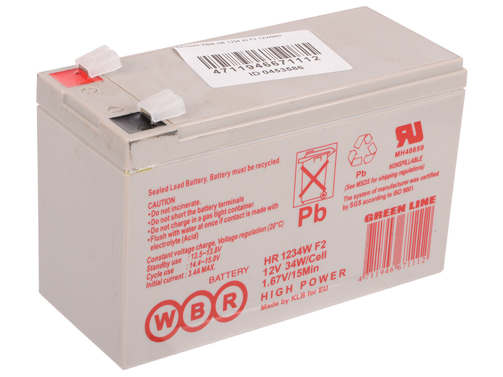 | Дополнительная информация | Аккумуляторные батареи WBR HR-1234W-- герметизированные, выполненные по технологии AGM, батареи общего применения со сроком службы до 7 лет в буферном режиме. Эти высокоэффективные перезаряжаемые батареи не требуют обслуживания в течение всего срока службы. |