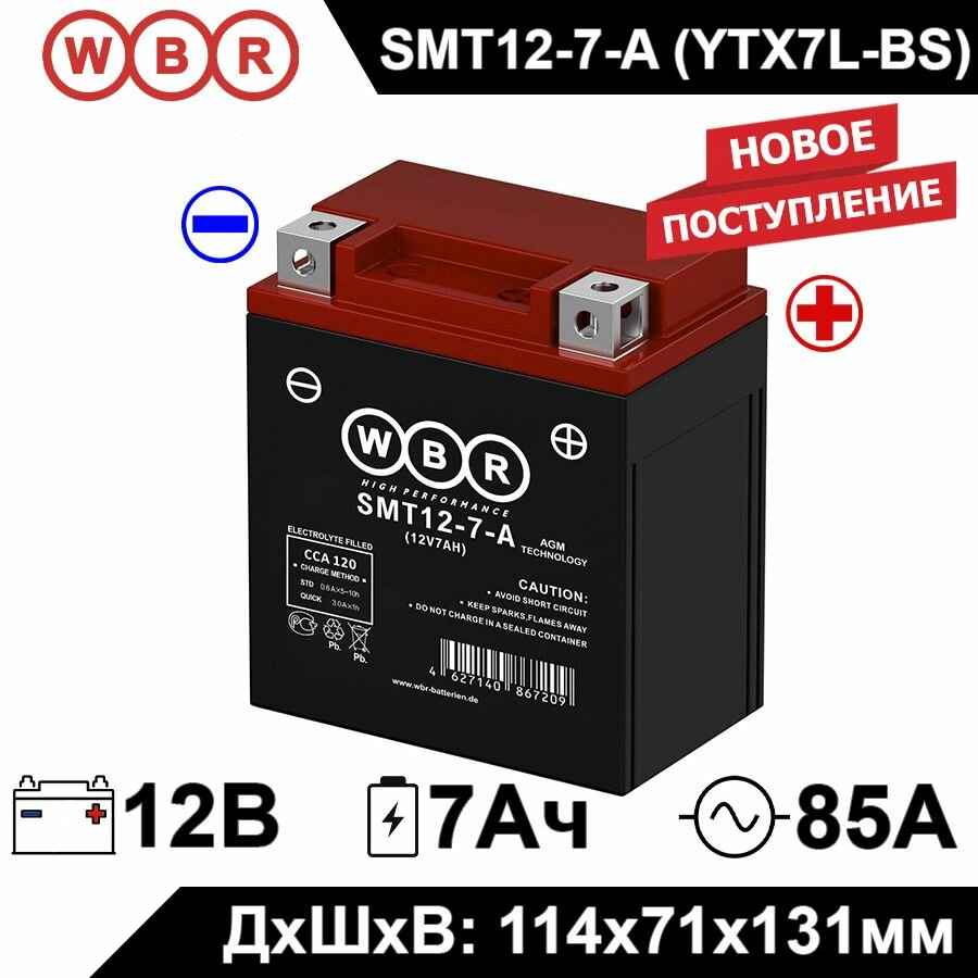 Купить Мото аккумулятор стартерный WBR MT12-7-A 12В 7Ач (12V 7Ah) полярность обратная 85A (YTX7L-BS, CT 1207.1) AGM, аккумулятор для мотоцикла, мопеда, скутера, квадроцикла, снегохода SMT12-7-A
