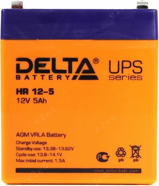 Батарея DELTA серия HR, HR 12-5, напряжение 12В, емкость 5Ач (разряд 20 часов), макс. ток разряда (5 сек.) 75А, макс. ток заряда 1.5А, свинцово-кислотная типа AGM, клеммы F2, ДxШxВ 90х70х101мм., вес 1.8кг., срок службы 8 лет. Delta UPS HR 12-5 (12V / 5Ah