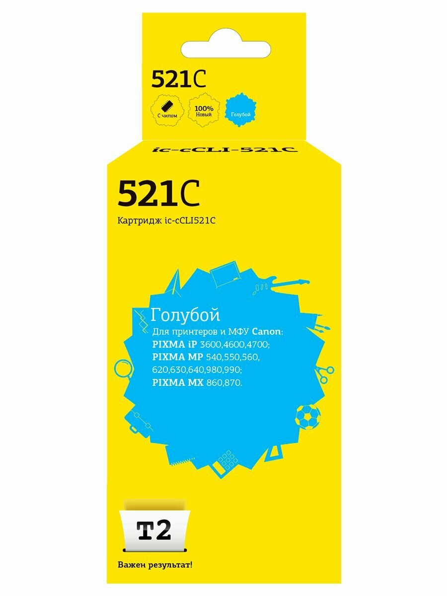 T2 Расходные материалы CLI-521C IC-CCLI-521C Картридж для Canon PIXMA iP3600 4600 4700 MP540 620 630 980, голубой, с чипом