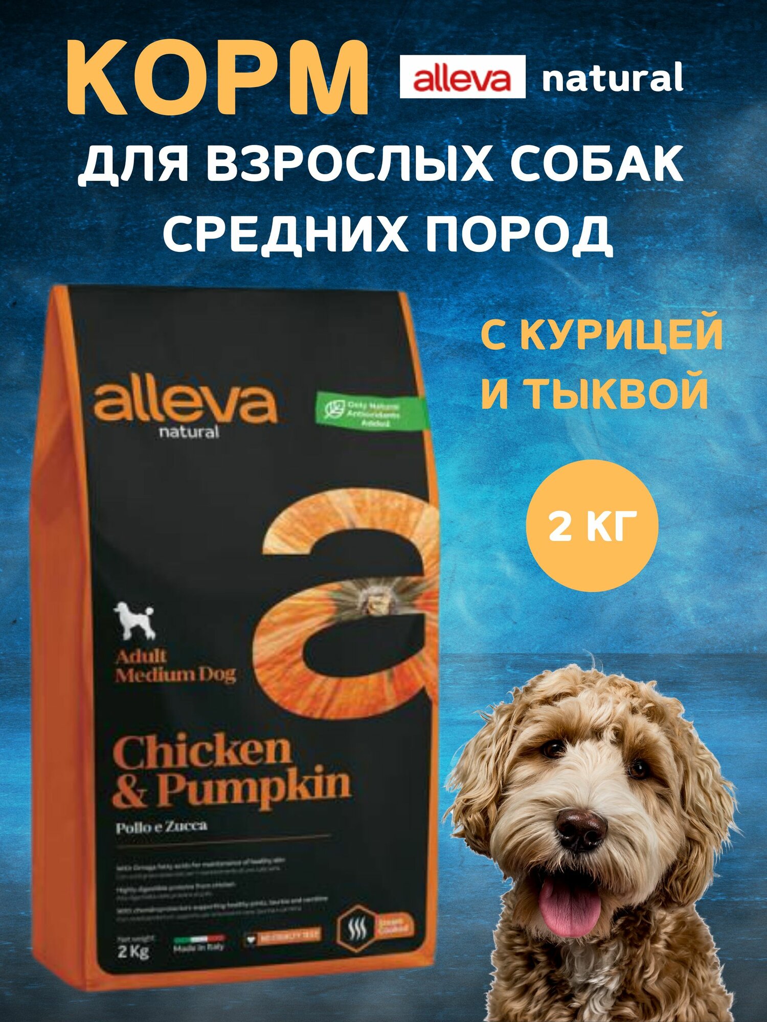 Корм Аллева Натурал для взрослых собак средних пород с курицей и тыквой, 2 кг