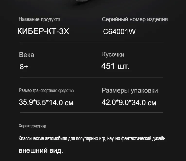 Ниже Вы можете прочитать отзывы на Конструктор «Kusanagi CT-3X» из Cyberpunk 2077 из 451 деталей, ознакомится с подробными характеристиками, посмотреть интересные обзоры и фотографии на Конструктор «Kusanagi CT-3X» из Cyberpunk 2077 из 451 деталей.