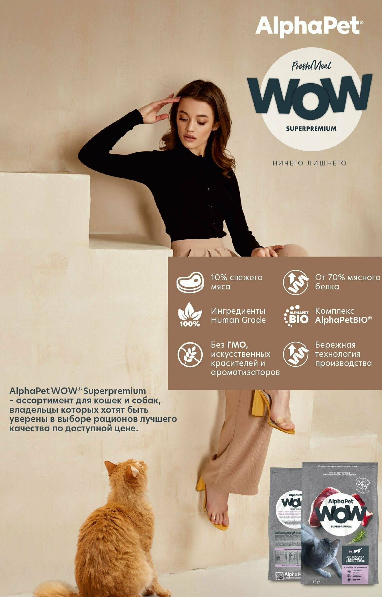 ALPHAPET WOW SUPERPREMIUM для взрослых кошек живущих дома с уткой и потрошками (1,5 кг)