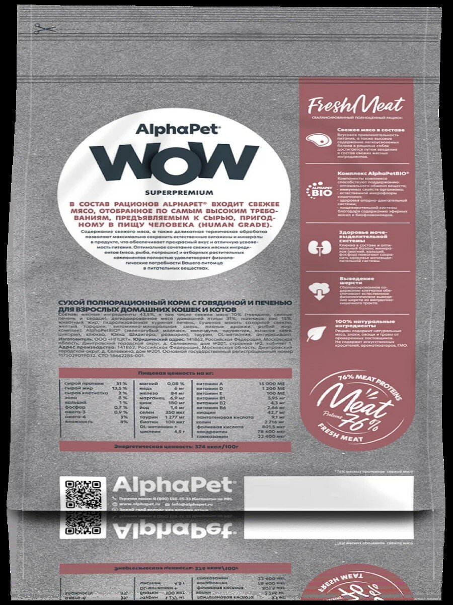 ALPHAPET WOW SUPERPREMIUM 350 г, сухой корм для взрослых домашних кошек и котов c говядиной и печенью, ALPHAPET WOW