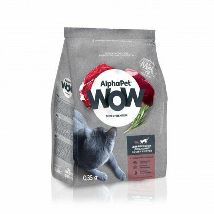 ALPHAPET WOW SUPERPREMIUM 350 г, сухой корм для взрослых домашних кошек и котов c говядиной и печенью, ALPHAPET WOW