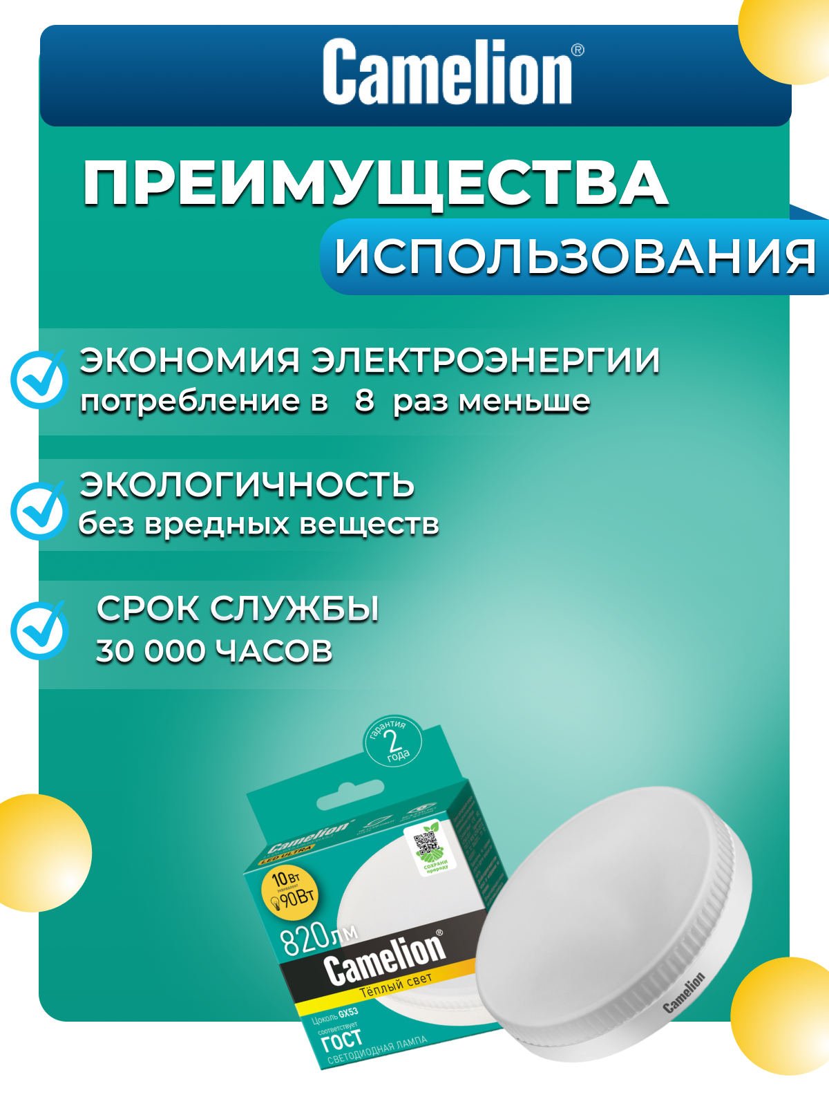 Эл.лампа светодиодная 10Вт 220В LED 10-GX53/830/GX53 (10W=90Вт 810Lm) Camelion