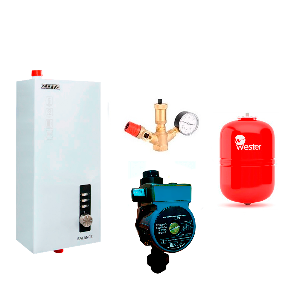 Котел электрический ZOTA Balance 15, комплект, насос 25/6, группа безопасности, бак Wester WRV 8
