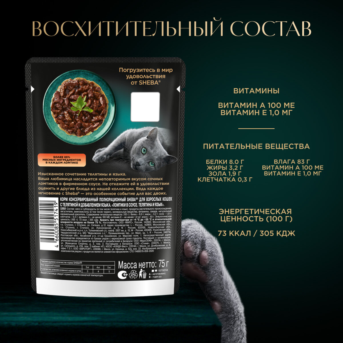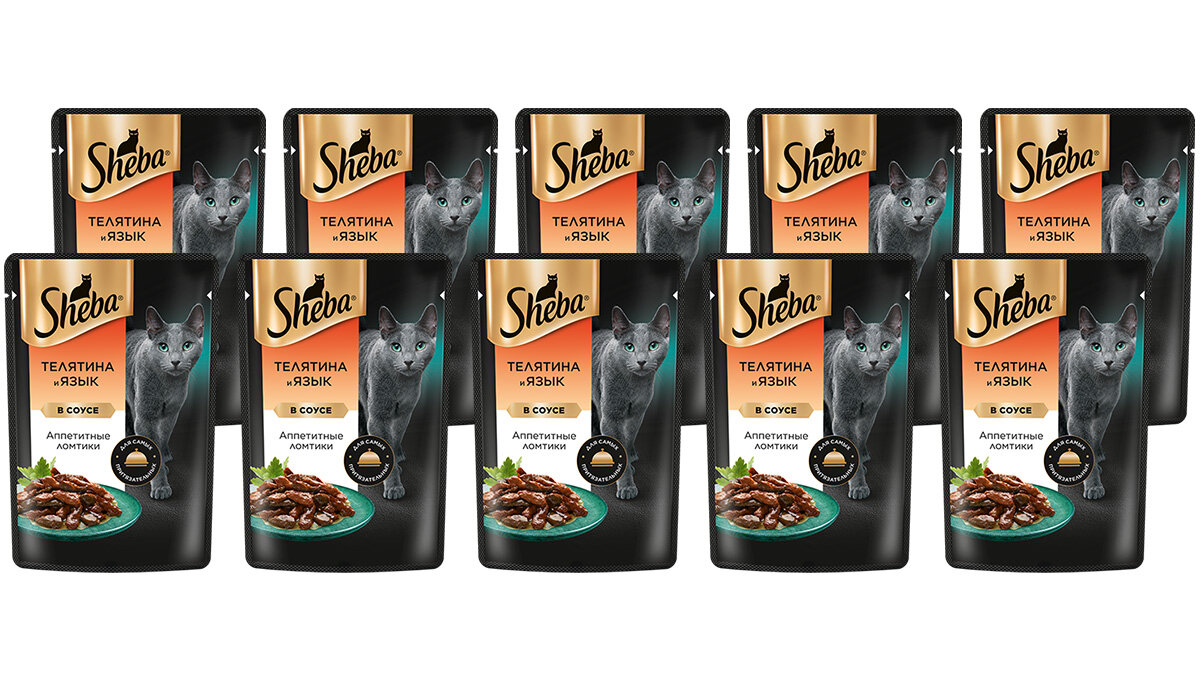 Купить SHEBA для взрослых кошек ломтики в соусе с телятиной и языком пауч 75 гр х 10 шт
