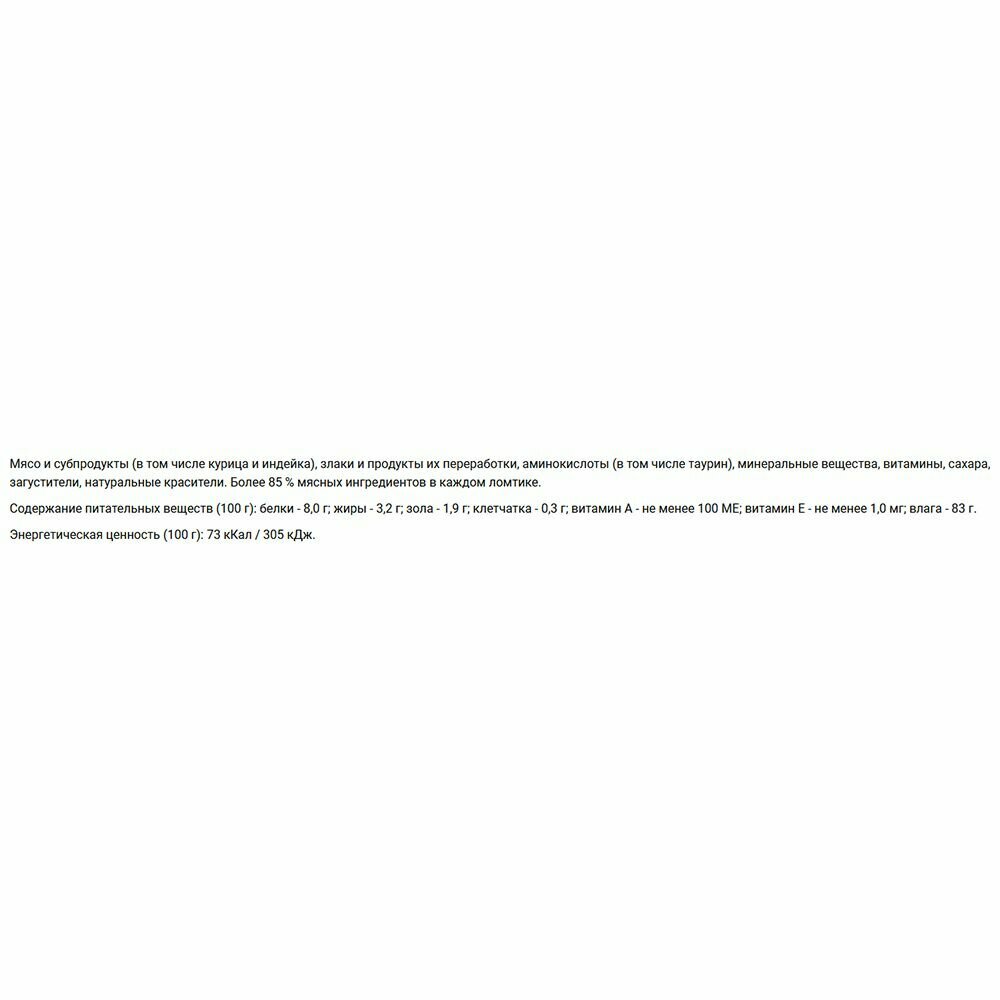 | Состав | мясо и субпродукты (в том числе курица и индейка), злаки и продукты их переработки, аминокислоты (в том числе таурин), минеральные вещества, витамины. Более 85% мясных ингредиентов в каждом ломтике |