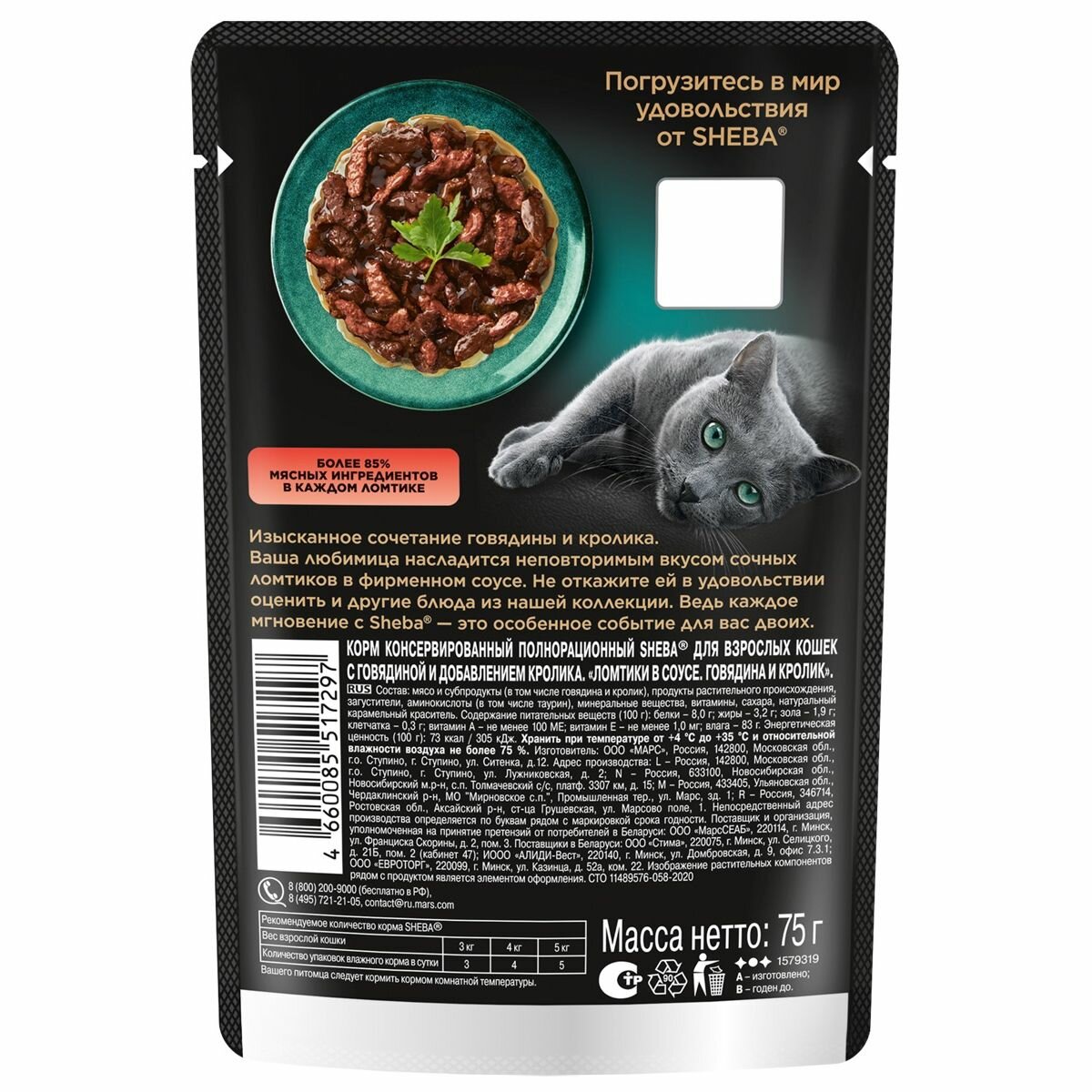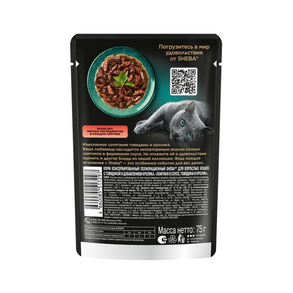 SHEBA для взрослых кошек ломтики в соусе с говядиной и кроликом пауч 75 гр х 5 шт