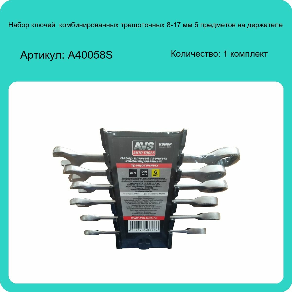 AVS A40058S Набор ключей комбинированных трещоточных 6 пр. 8-17 мм на держателе AVS