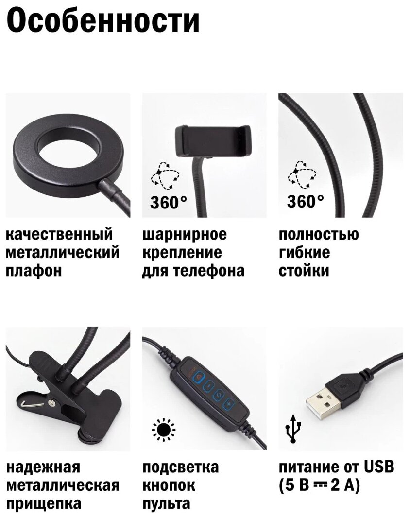 СохранитьARTSTYLE TL-604B Светильник на прищепке, черный (настольный кольцевой светодиодный, димм, с держателем для телефона) интересное: