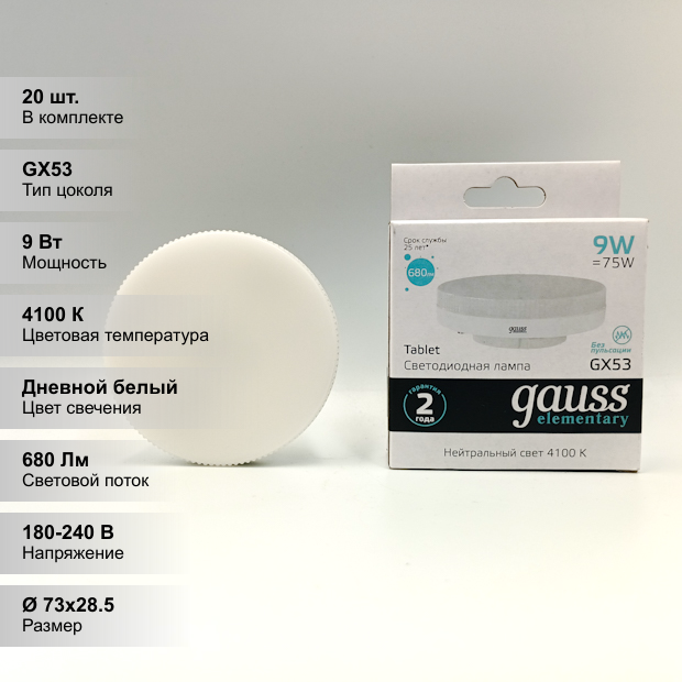 (25 шт.) Светодиодная лампочка Gauss LED Elementary, мощность 9 Вт, напряжение питания 180-240 В, цветовая температура 4100 K, нейтральный белый свет, цоколь GX53, размер 73х28.5 мм