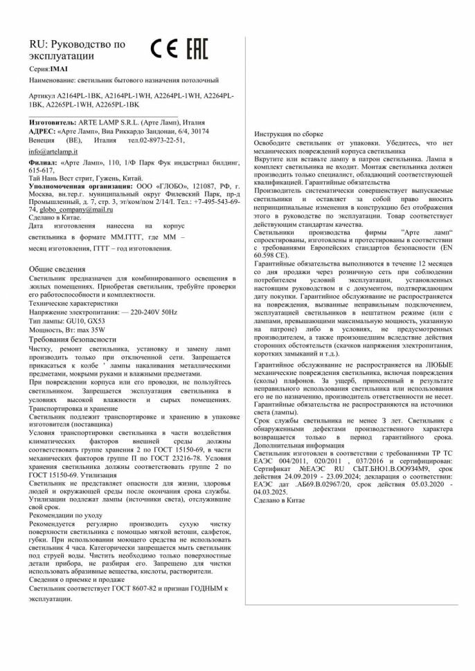 Светильник потолочный Arte lamp A2164PL-1BK IMAI