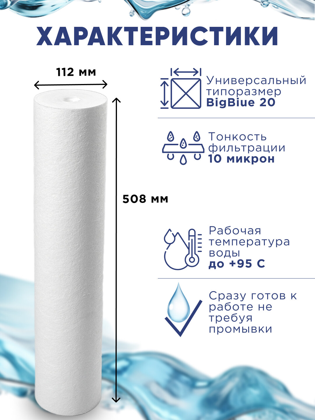 Картридж из полипропилена PP-20BB 10 мкм ЭФГ 112/508, ПП-20ББ фильтр полипропиленовый грубой очистки воды, механика для Гейзер, Барьер, Аквафор, 9 шт