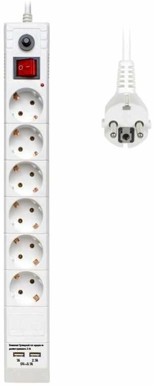 Сетевой фильтр Buro BU-SP5_USB_2A-W, 6 розеток, 5 м, с/з, 10А / 2200 Вт белый