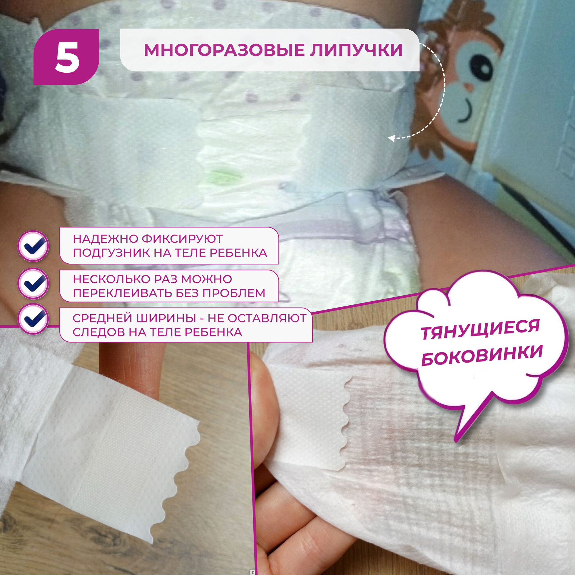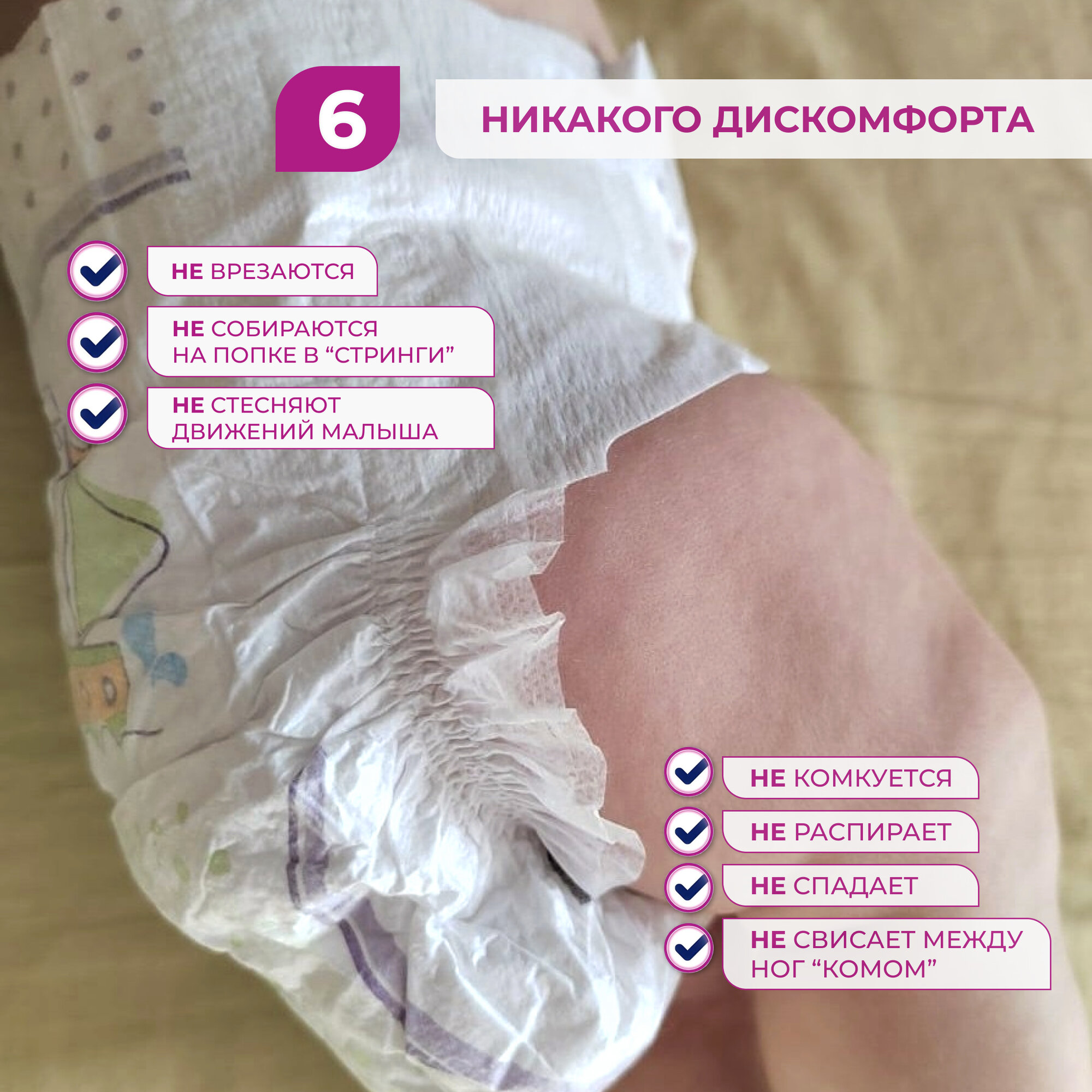 | Особенности | боковые внутренние бортики / многоразовые застежки-липучки / эластичные резинки вокруг ножек / эластичный пояс |