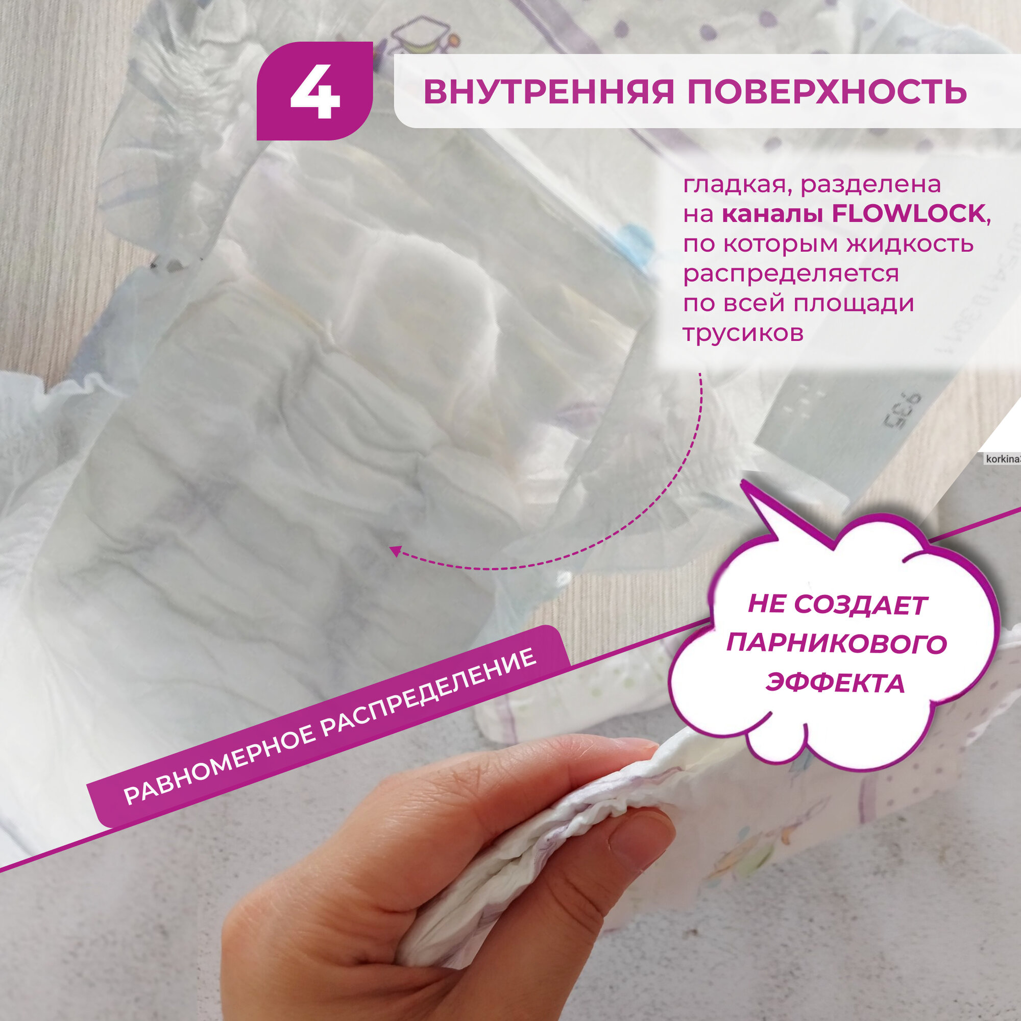 | Минусы: | При наполнении на половину, попа становится скользкой, а памперс влажным снаружи. |