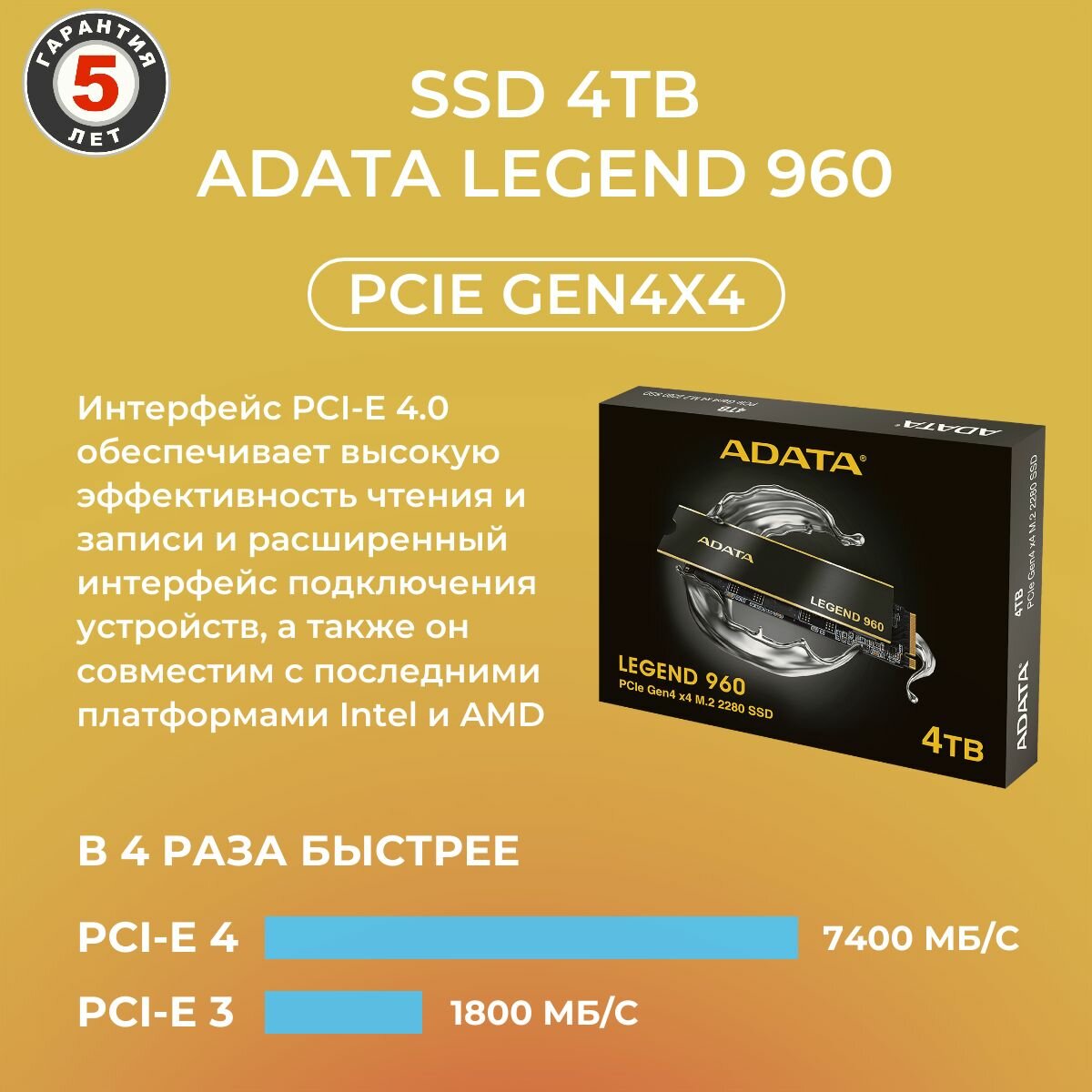 Твердотельный накопитель SSD 4TB ADATA LEGEND 960,M.2(22x80mm), NVMe 1.4, PCIe 4.0 x4, 3D NAND, R/W 7400/6800MB/s, IOPs 750 000/630 000, TBW 3120, DWPD 0.43, with t Heat Sink (5 лет)